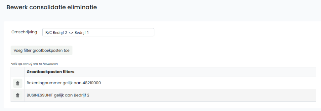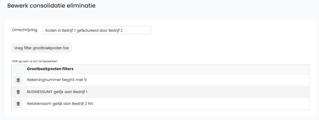 Via dit menu kan u instellen welke grootboekposten als intercompany-transacties geëlimineerd zullen worden. We illustreren dit aan de hand van enkele voorbeelden.