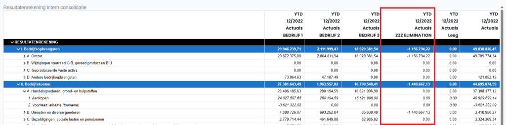 Na het synchroniseren van het consolidatiedossier verschijnt er een fictieve BUSINESSUNIT met de naam “ZZZ ELIMINATION”, die alle transacties die aan de ingestelde filters voldoen, fictief “tegenboekt”: