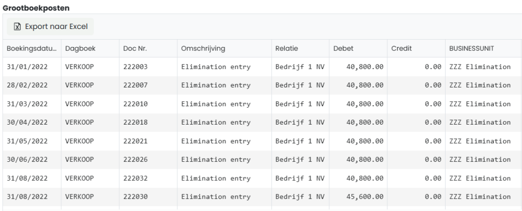 In de drillthrough van de betreffende rekeningen zijn de eliminatieposten te zien: