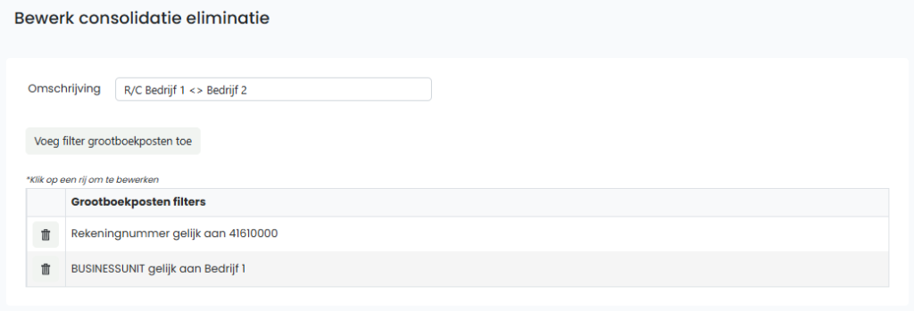 Voorbeeld1: “Bedrijf 2” richt verkoopfacturen aan “Bedrijf 1”, en we willen deze in de geconsolideerde rapportage elimineren. In dit geval stellen we twee eliminaties in: