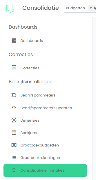 In een bedrijf dat ingesteld is als consolidatiebedrijf is de menu-optie “Consolidatie-eliminaties” beschikbaar: